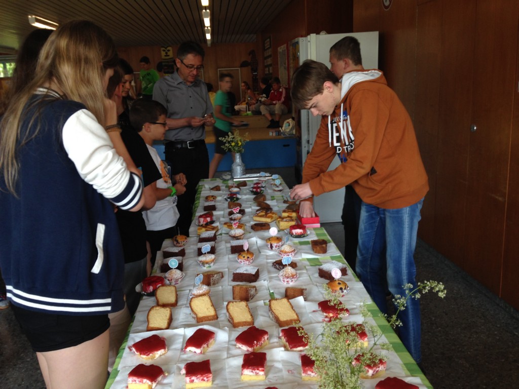 Glücklicherweise erfuhren wir in der Umsetzung unseres Vorhabens viel Unterstützung. Zu aller erst von seitens unseres Direktors, der es ermöglichte in einer großen Pause ein Kuchenbuffet für SchülerInnen und LehrerInnen anzubieten. Und unser zweites „Standbein“ bildete die Kommunikation zwischen dem Fairtrade-Arbeitskreis (Martina Fischer) und dem Adeg-Inhaber Florian Ebner. So wurden wir eingeladen am Markttag beim Adeg einen Verkaufsstand zu betreuen und so mit Kuchen und fair gehandeltem Kaffee Geld für unser Projekt zu sammeln.