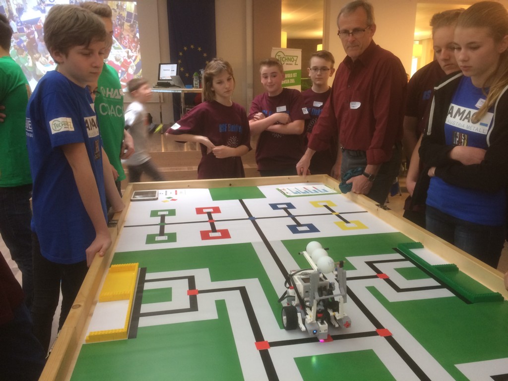 Die Teams mussten die Roboter so aufbauen und programmieren, dass diese die je vier Aufgaben in möglichst kurzer Zeit absolvierten. Im ersten Durchgang waren Rohstoffe aufzuspüren, indem der Roboter einen Hinweis in Form eines Farbplättchens bekam. Entsprechend dieser Farbe musste der Roboter eine Position anfahren, dort für eine bestimmte Zeit warten und dann zum Ausgangsort zurückkehren. Bei den weiteren Aufgaben mussten Rohstoffe gesammelt und optimiert zu bestimmten Betrieben gefahren werden.