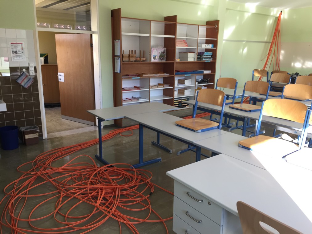 Um die Digitalisierung durchführen zu können, braucht es aber auch eine entsprechende Infrastruktur. In einer ersten Bauetappe wurde deshalb in den Sommerferien das komplette Schulgebäude mit Breitband-Internet ausgestattet. Tausende Meter Glasfaserkabel wurden verlegt, alle Klassen und Sonderräume entsprechend angeschlossen.