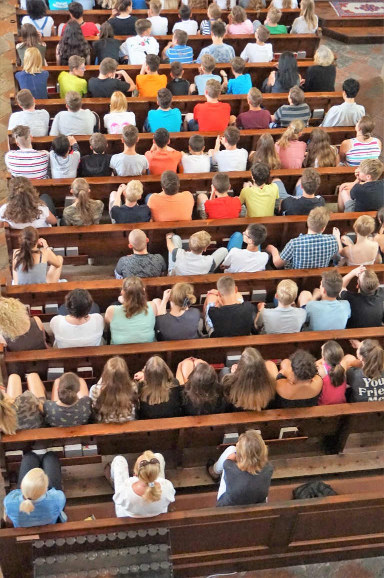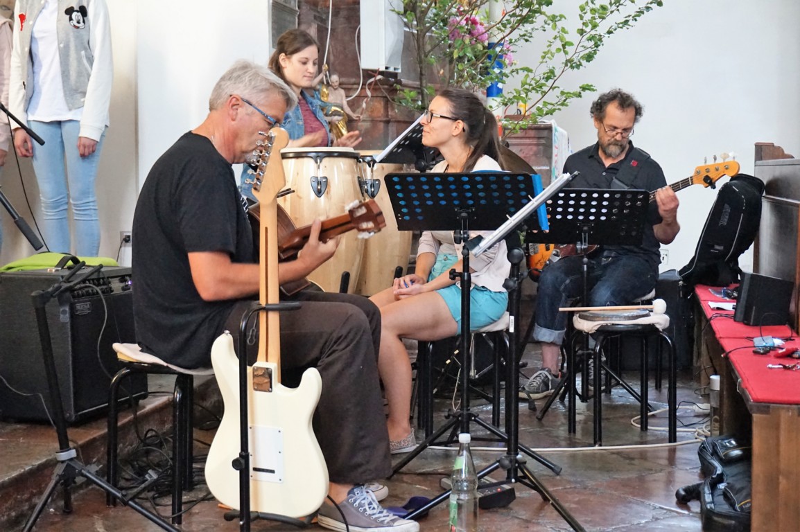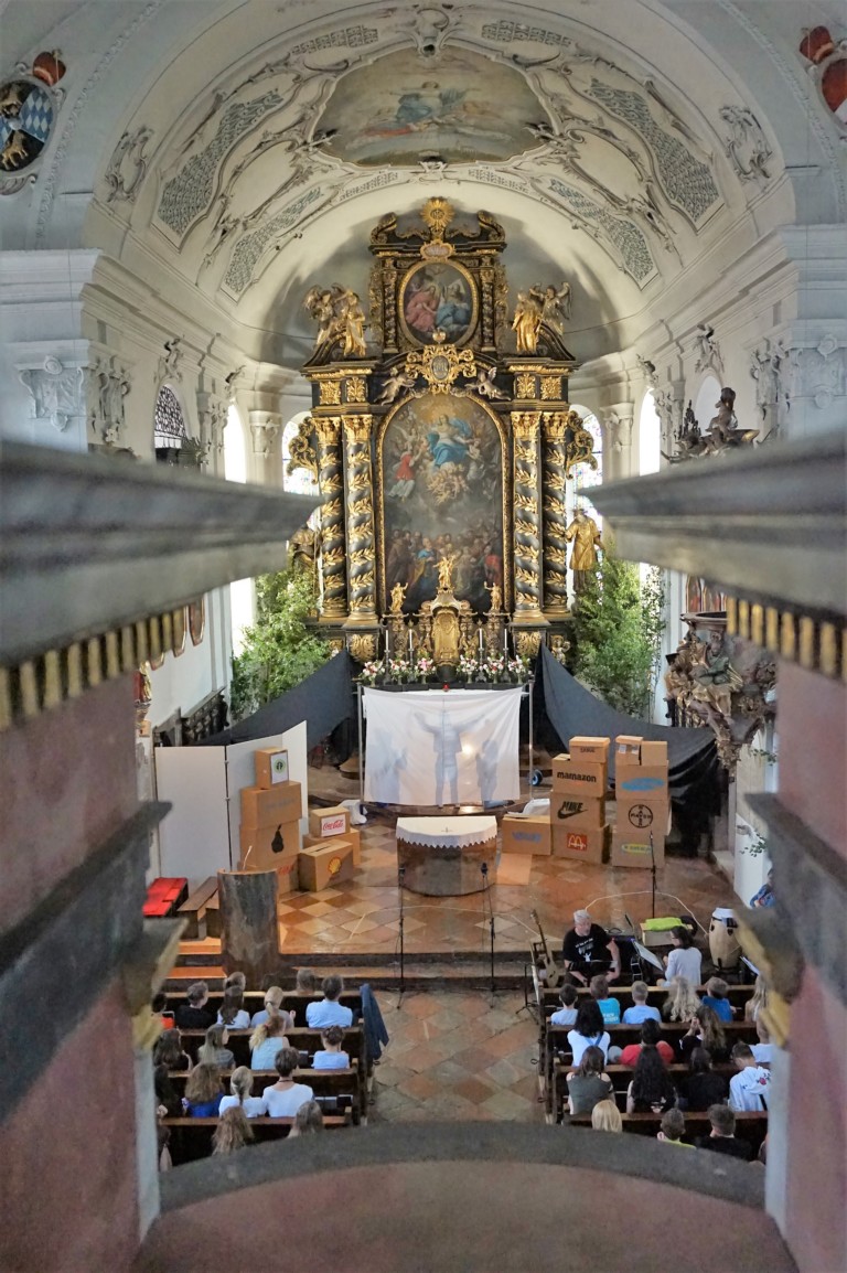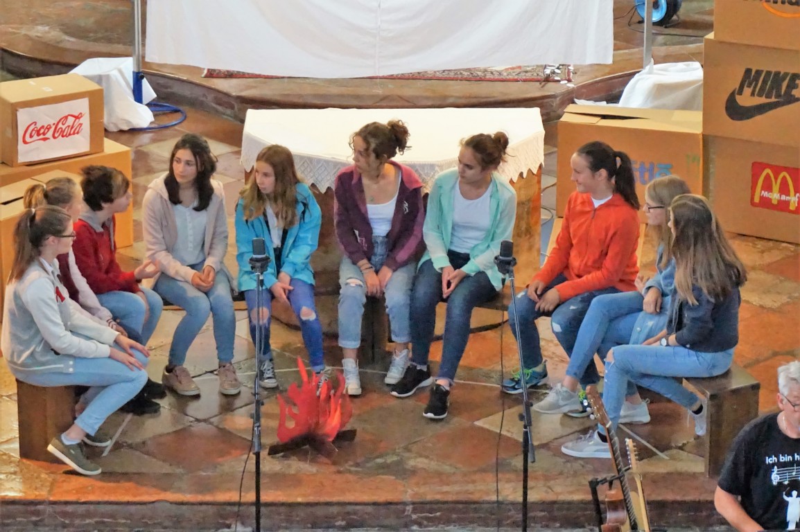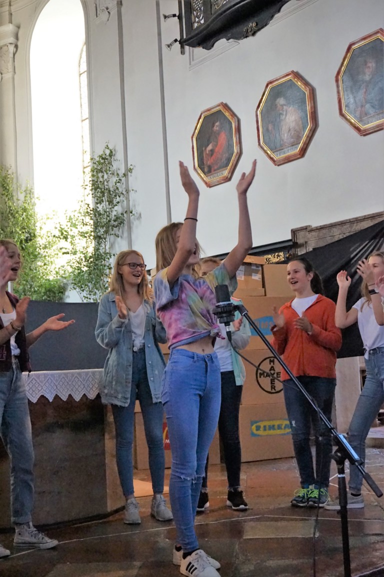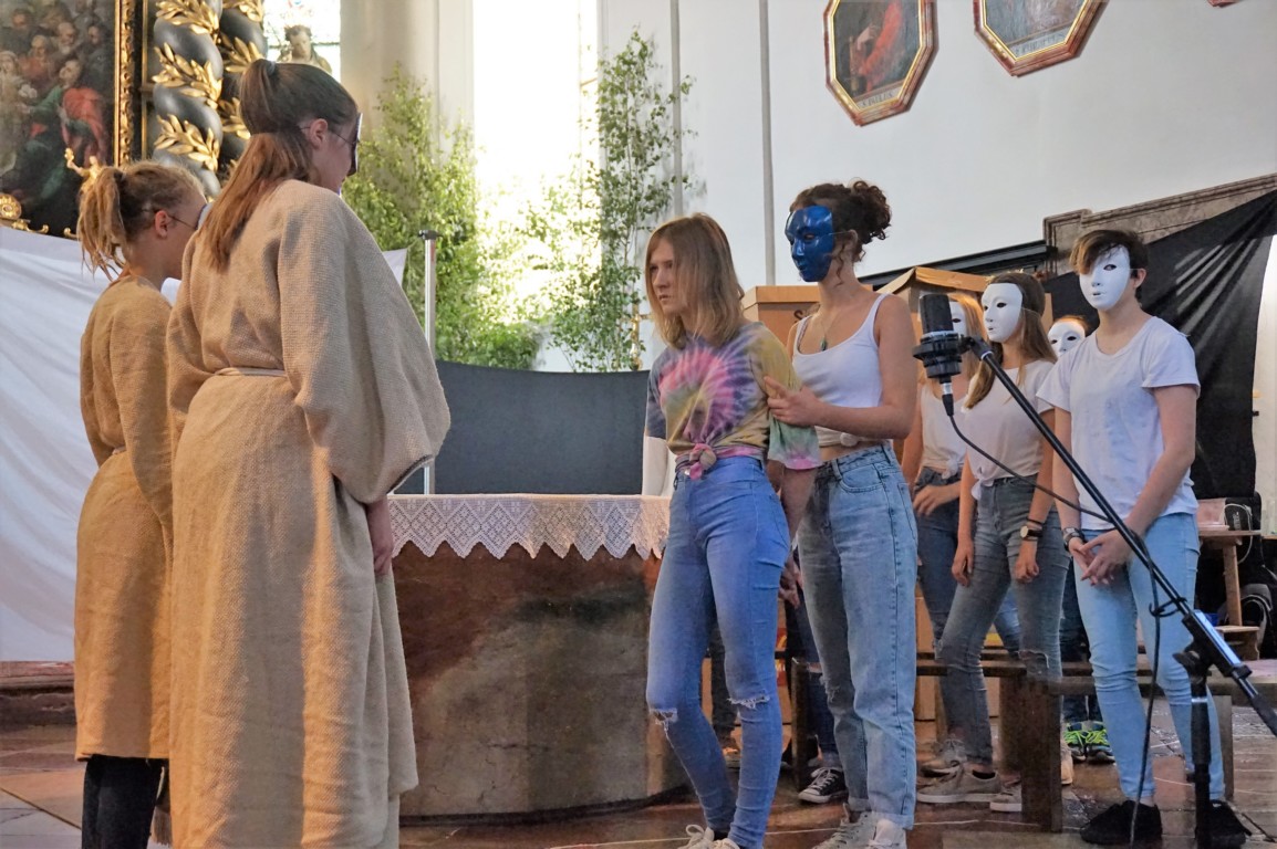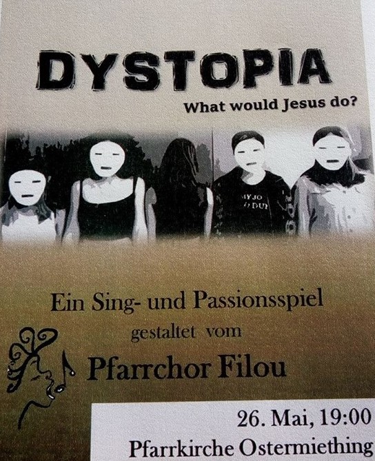 Der Ostermiethinger Pfarrchor Filou präsentierte in der Pfarrkirche das Stück „Dystopia – What would Jesus do?“. Der Chor Filou ist ein Theater- und Chorprojekt der Pfarre und der Neuen Mittelschule (NMS) Ostermiething. Er besteht aus 12 Mädchen der 4. Klassen aus Tarsdorf, Haigermoos, Franking und Ostermiething. Diese zeigten das Stück mit viel musikalischem sowie schauspielerischem Talent und einer großen Portion Mut. Als Musiker begleiteten Reinhard Gnaiger, Christine Schernberger, Christian Münzker (Bass) und Michaela Neuhauser (Percussion) die Schülerinnen.
