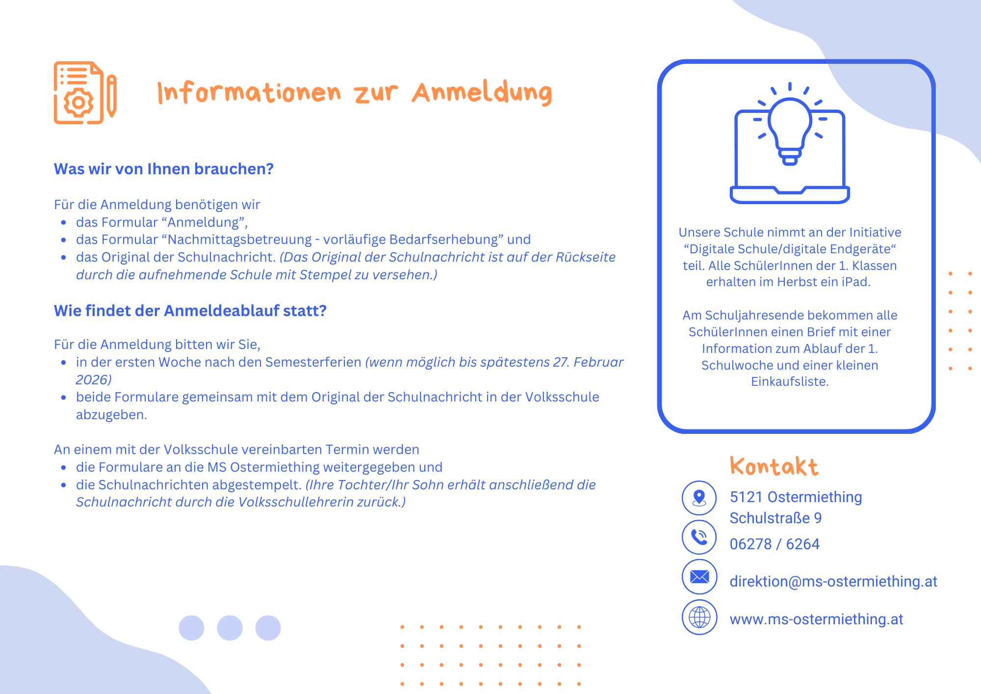 Über die Anmeldung Ihrer Tochter/Ihres Sohnes freut sich das Kollegium der MITTELSCHULE OSTERMIETHING.