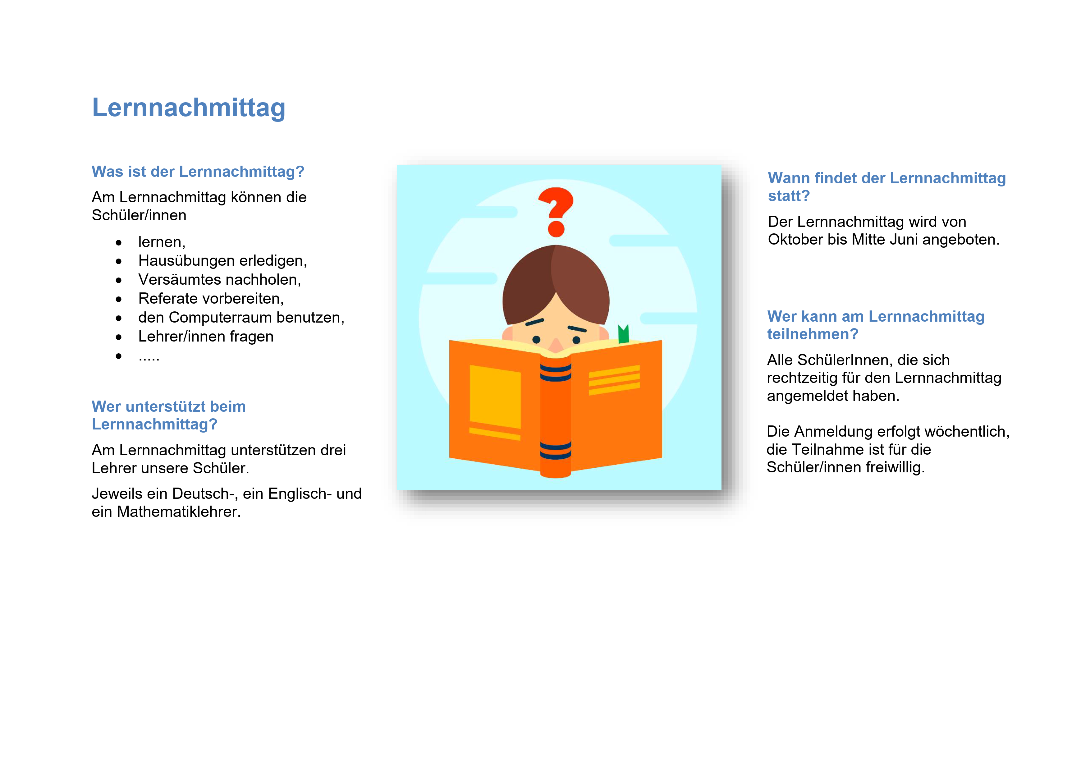 - Für Fragen und weitere Auskünfte können Sie gerne an der Schule anrufen oder unsere Schule an einem vereinbarten Termin besuchen.