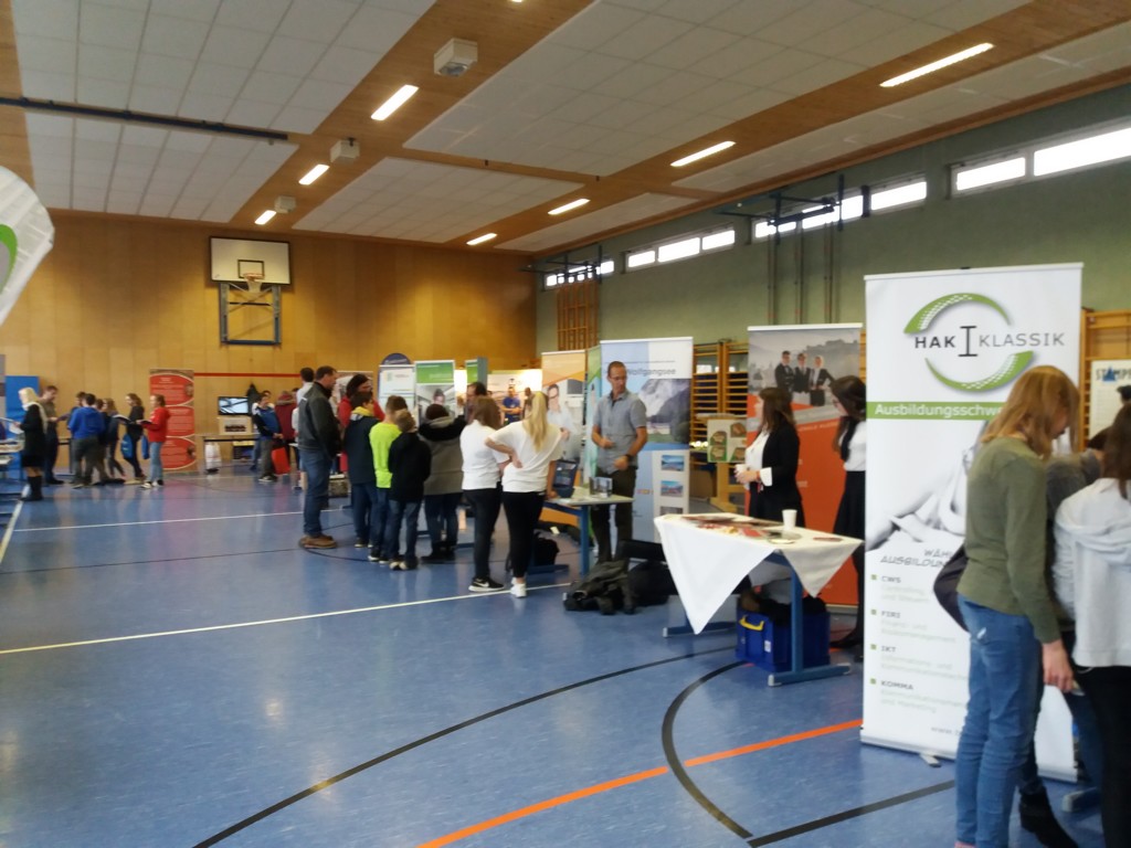 Im Schulhaus fand der Elternsprechtag statt und im Turnsaal bekamen die Schüler und Schülerinnen bei 15 verschiedenen Schulen und 8 verschiedenen Betrieben Informationen zu Ausbildungsschwerpunkten, Stundentafeln, freien Lehrstellen und Ausbildungsmöglichkeiten in der Region.
