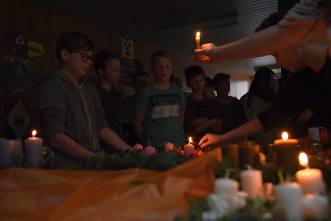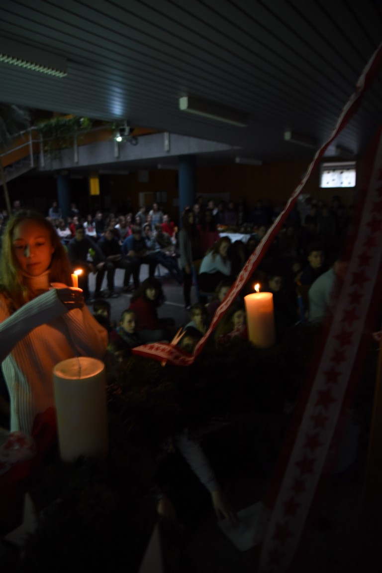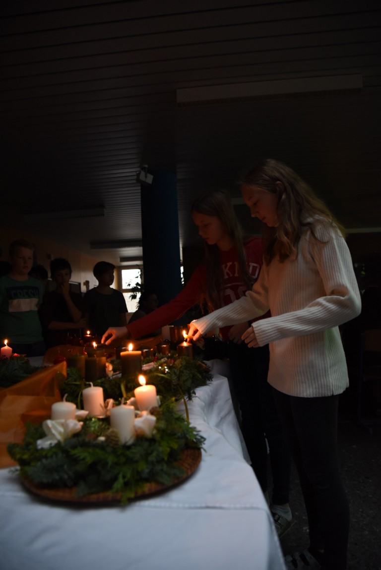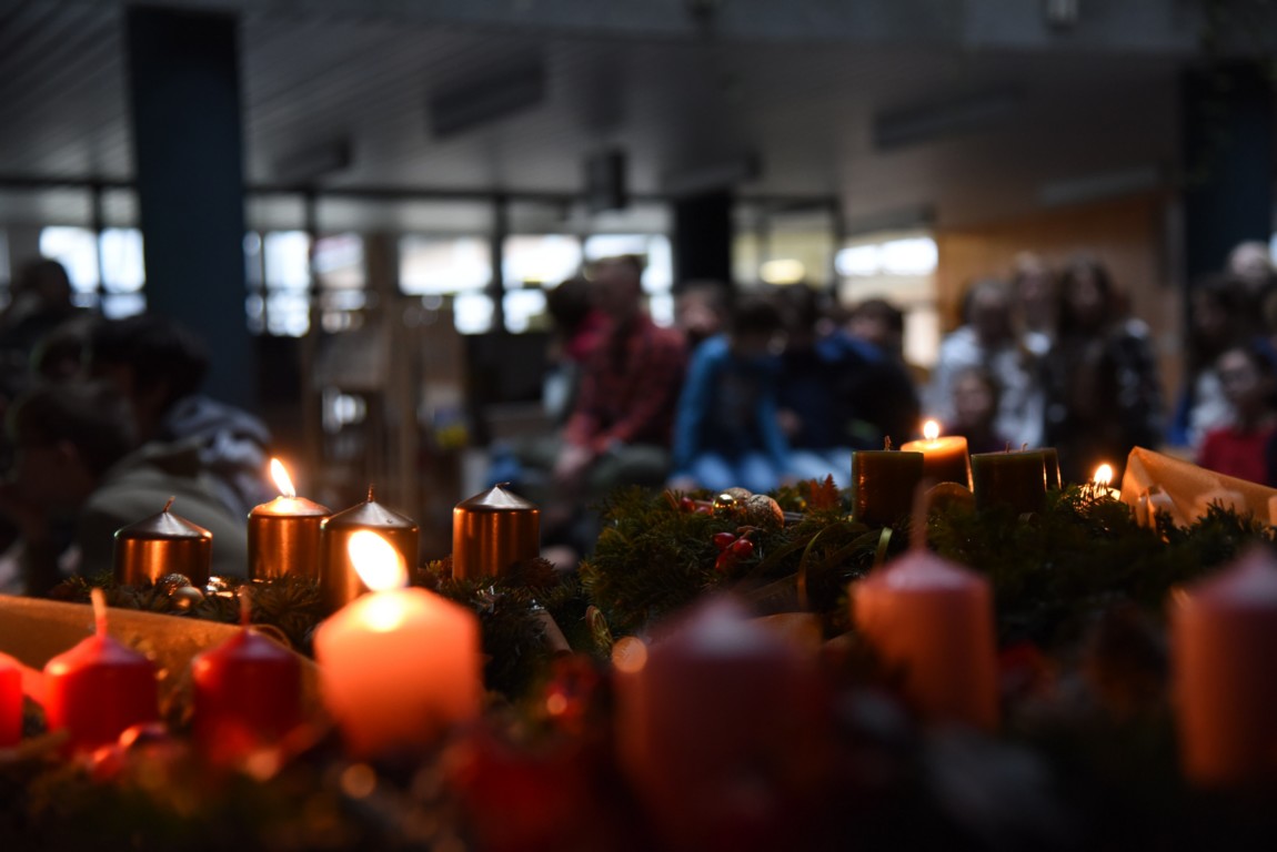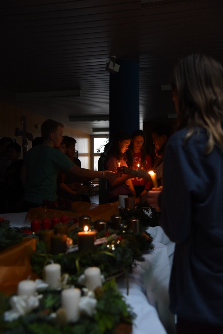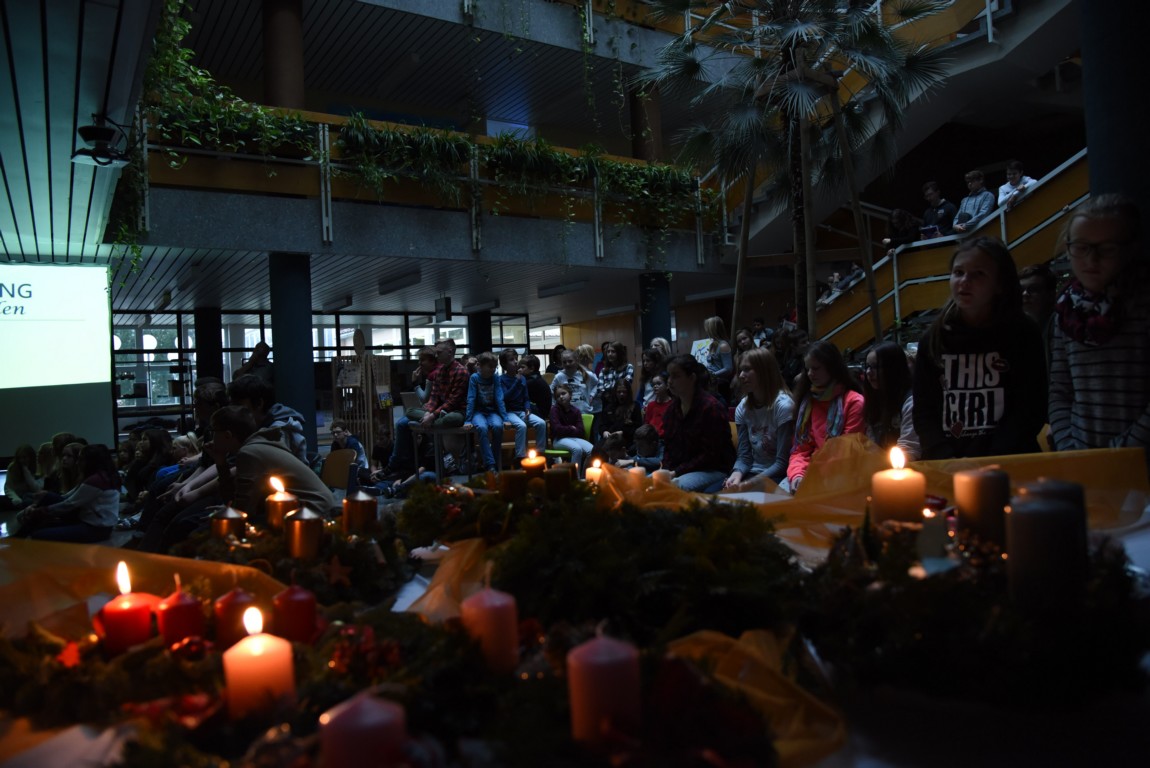 Am 30. November feierten wir in der Aula der Schule eine schöne, weihnachtliche Besinnung als Einstimmung in den Advent. Jede Klasse brachte ihren eigenen Adventkranz mit. Im Rahmen des Wahlpflichtfaches Kreatives Gestalten banden Schülerinnen der 4. Klasse unter der Anleitung von Fr. Petra Mösenbichler bereits mehrere Tage vorher einen riesigen Adventkranz für die Aula.
