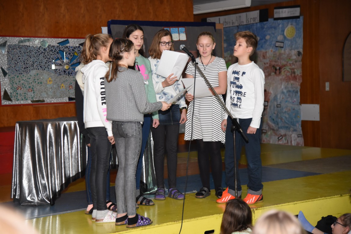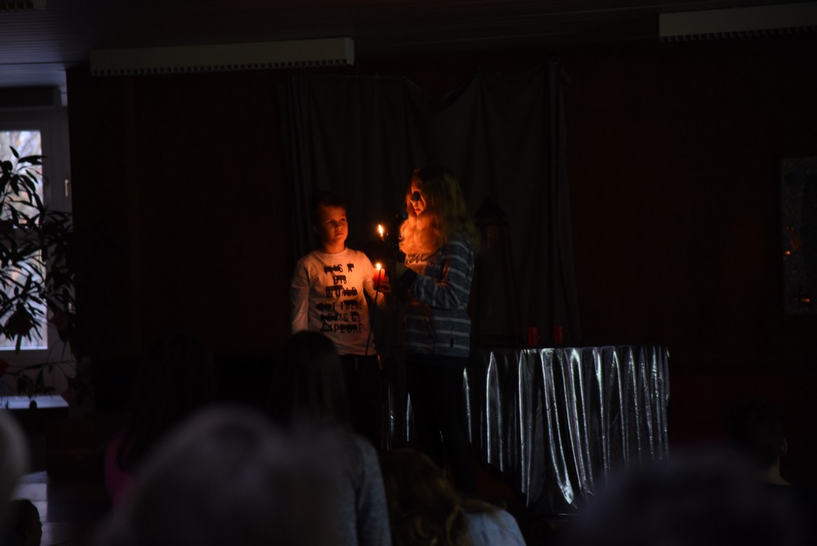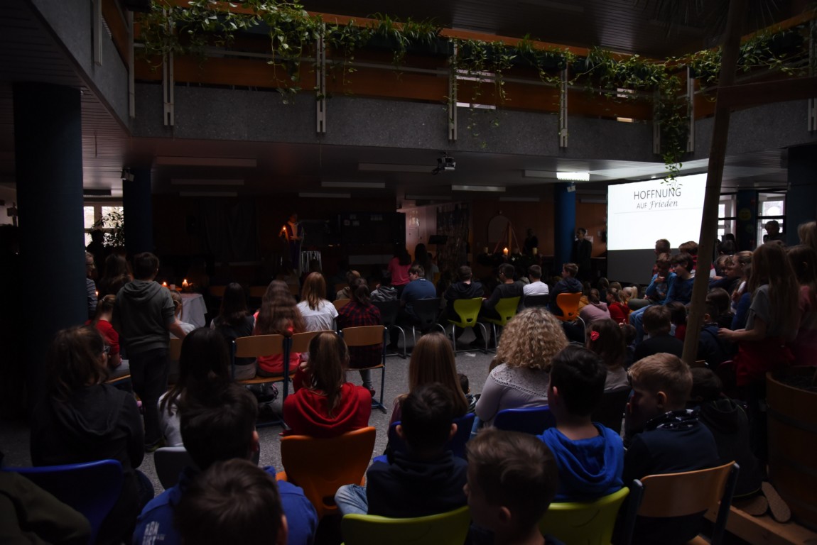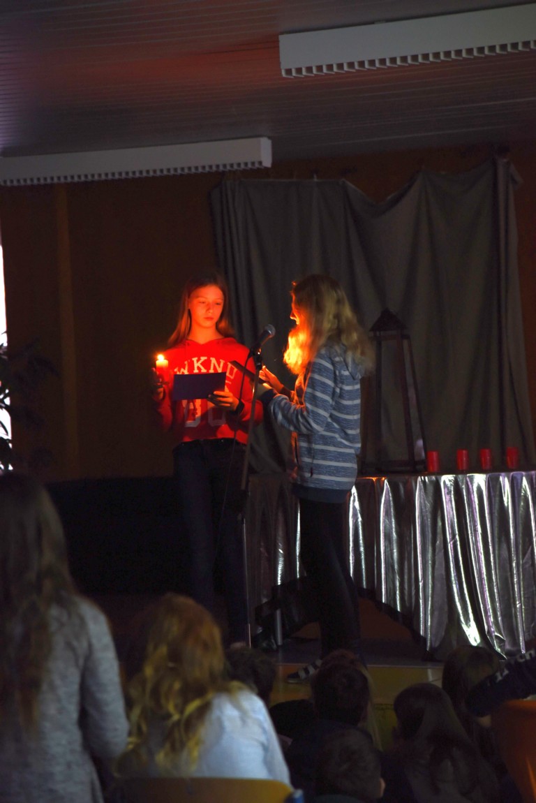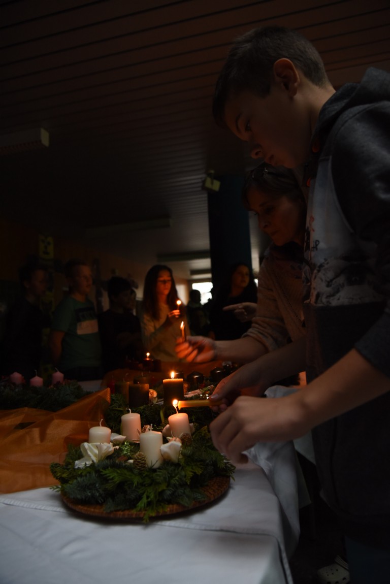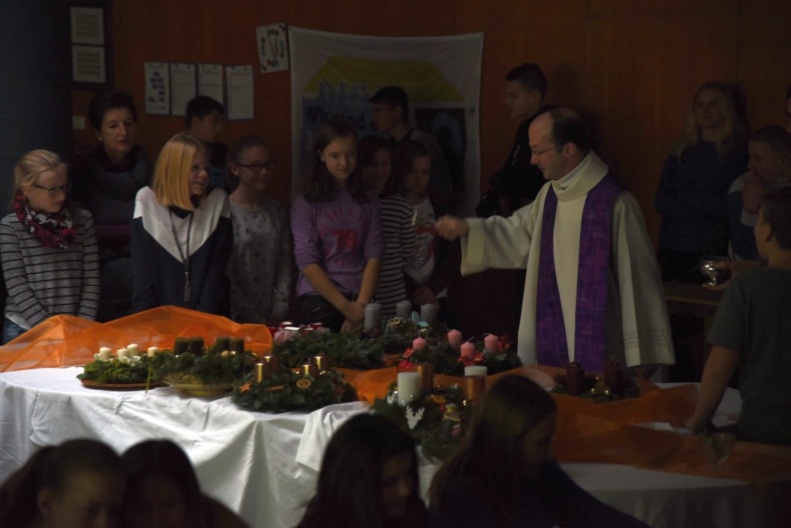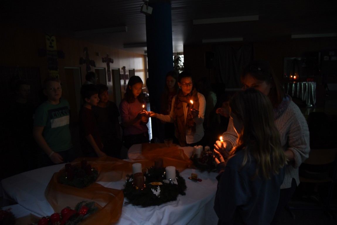 Am 30. November feierten wir in der Aula der Schule eine schöne, weihnachtliche Besinnung als Einstimmung in den Advent. Jede Klasse brachte ihren eigenen Adventkranz mit. Im Rahmen des Wahlpflichtfaches Kreatives Gestalten banden Schülerinnen der 4. Klasse unter der Anleitung von Fr. Petra Mösenbichler bereits mehrere Tage vorher einen riesigen Adventkranz für die Aula.