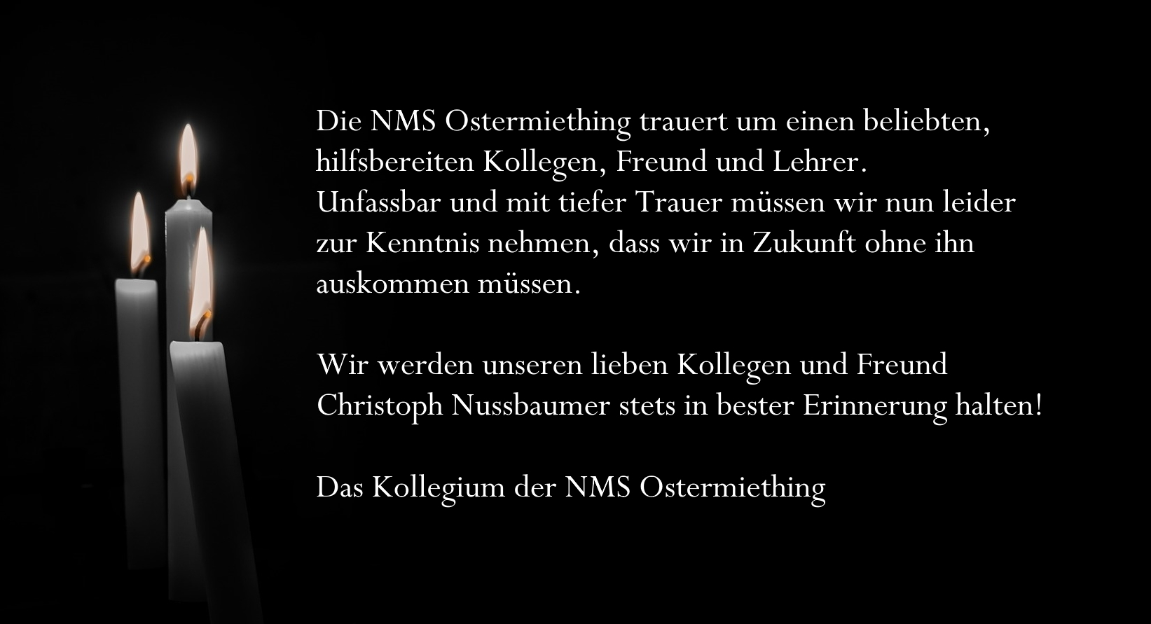 Unser Kollege Christoph Nussbaumer verunglückte am Ende des letzten Schuljahres bei einem Verkehrsunfall. Unfassbar und mit tiefer Trauer müssen wir zur Kenntnis nehmen, dass wir in Zukunft ohne ihn auskommen müssen.