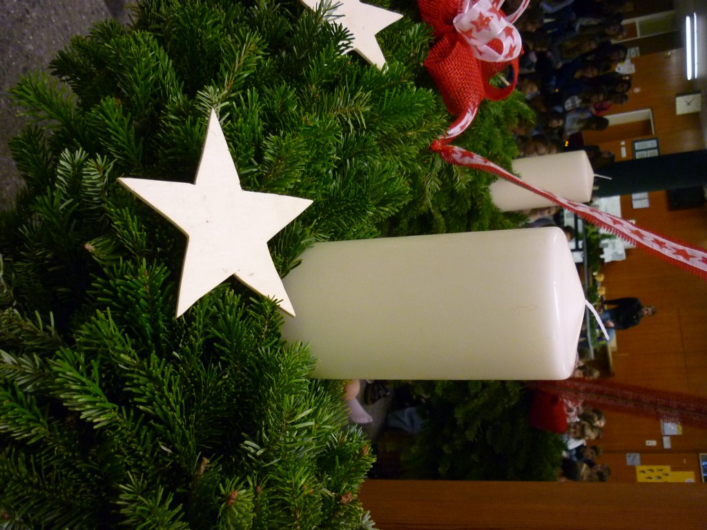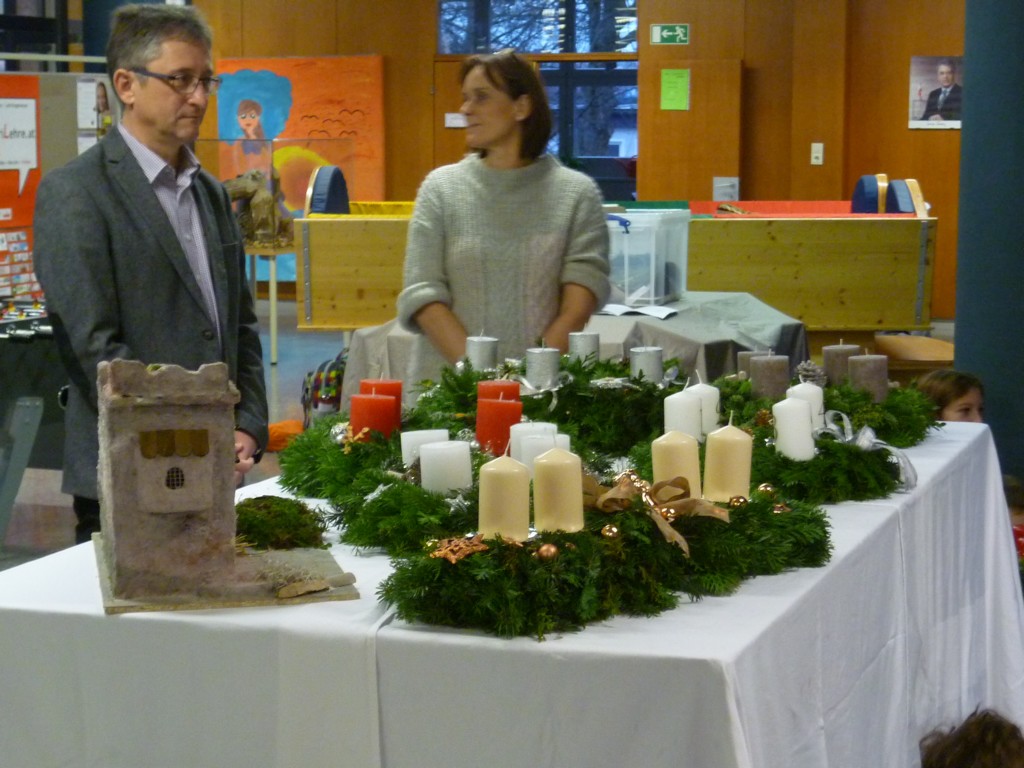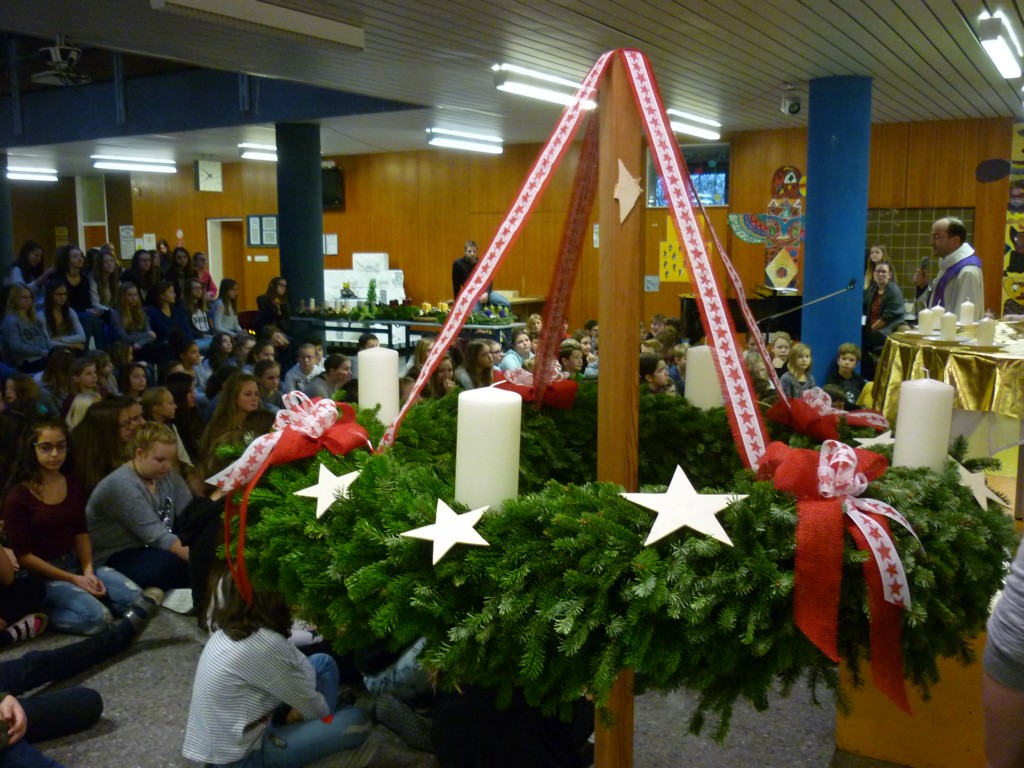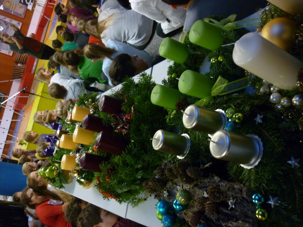 Alljährlich findet Ende November an unserer Schule eine Adventkranzweihe statt. In der Vorbereitung dazu binden unsere Schüler unter der Anleitung von Fr. Anneliese Maier einen Adventkranz für die Aula. Er hat einen Durchmesser von 1,6 Metern und gehört damit zu den größten Adventkränzen in unserer Umgebung. Gestaltet wird die Adventkranzweihe von unserer Religionslehrerin Fr. Christina Schernberger und unseren Schülern. Besonders freuen wir uns, dass unser Pfarrer Mag. Markus Menner zu uns kommt und die Weihe durchführt. |